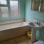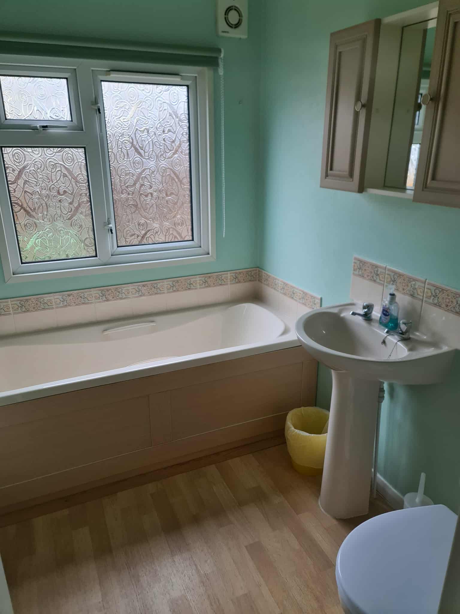 BATHROOM- suite comprising panelled bath, pedestal hand basin, low level WC, mirror fronted medicine cabinet, part tiled walls, panelled radiator, towel rail, extractor fan