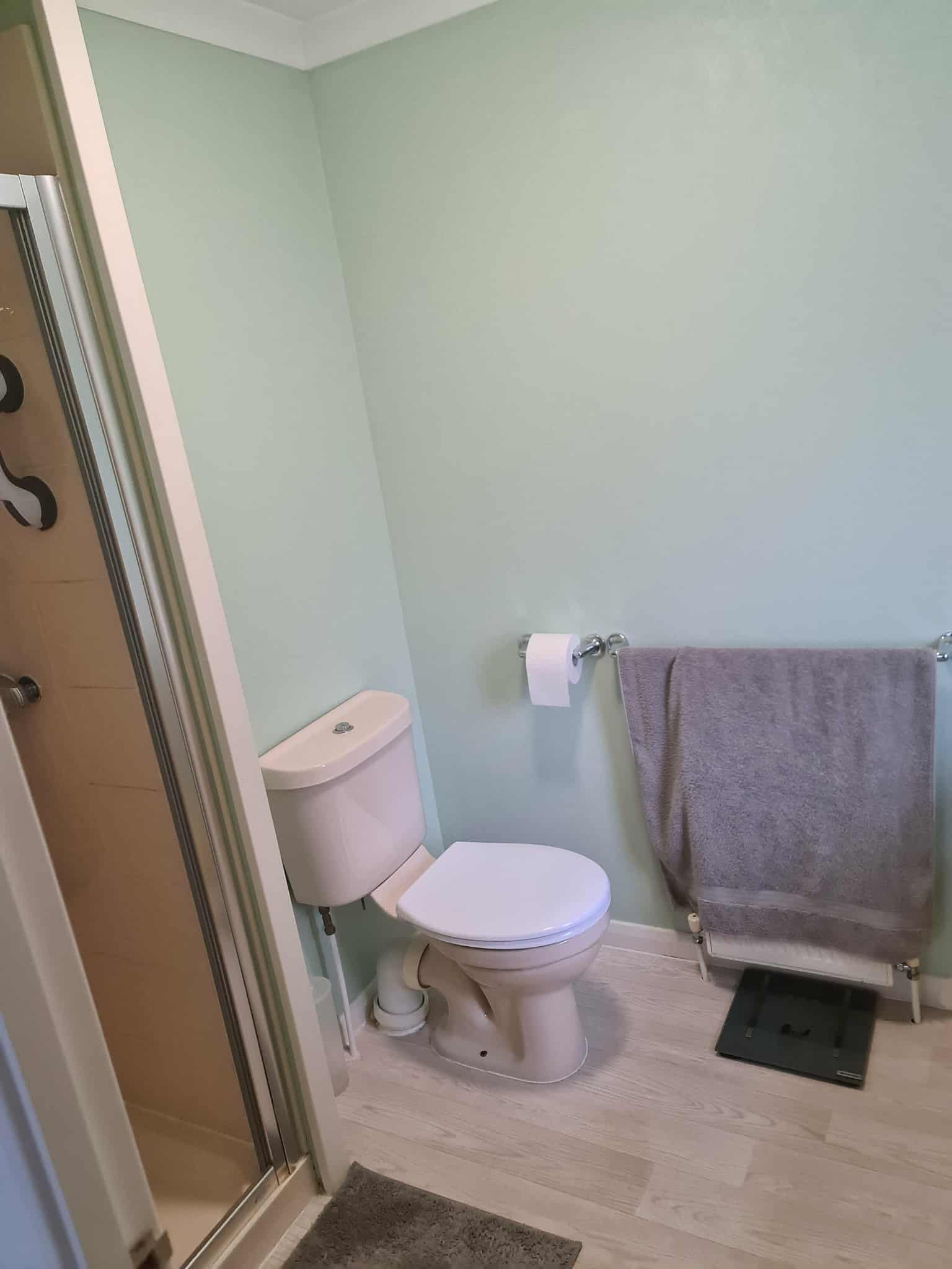 EN-SUITE SHOWER ROOM- tiled shower cubicle with folding door and pan shower head, low level WC, vanity hand basin, part tiled walls, panelled radiator, mirror with strip light and shaver point, extractor fan, vinyl flooring