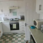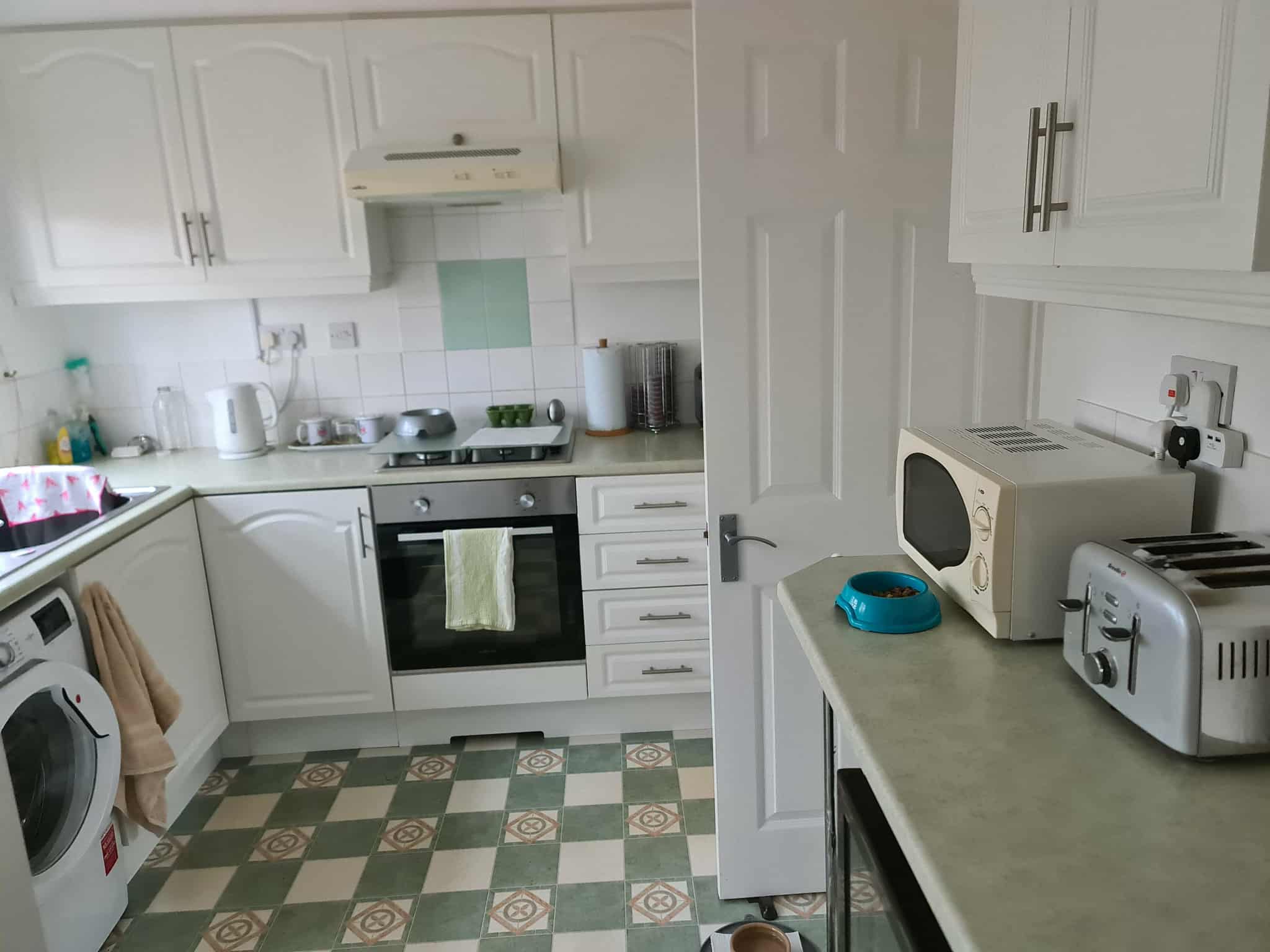 FITTED KITCHEN- 10’9 x 9’3 max, single drainer stainless steel sink unit with cupboards under, range of white coloured base and eye level units, LPG gas hob with Lamona Leica electric cooker, breakfast bar, part tiled walls, power points, LED light, cupboard enclosing Valiant LPG combi boiler for central heating and domestic hot water, water softener,plumbing for automatic dishwasher, door to garden