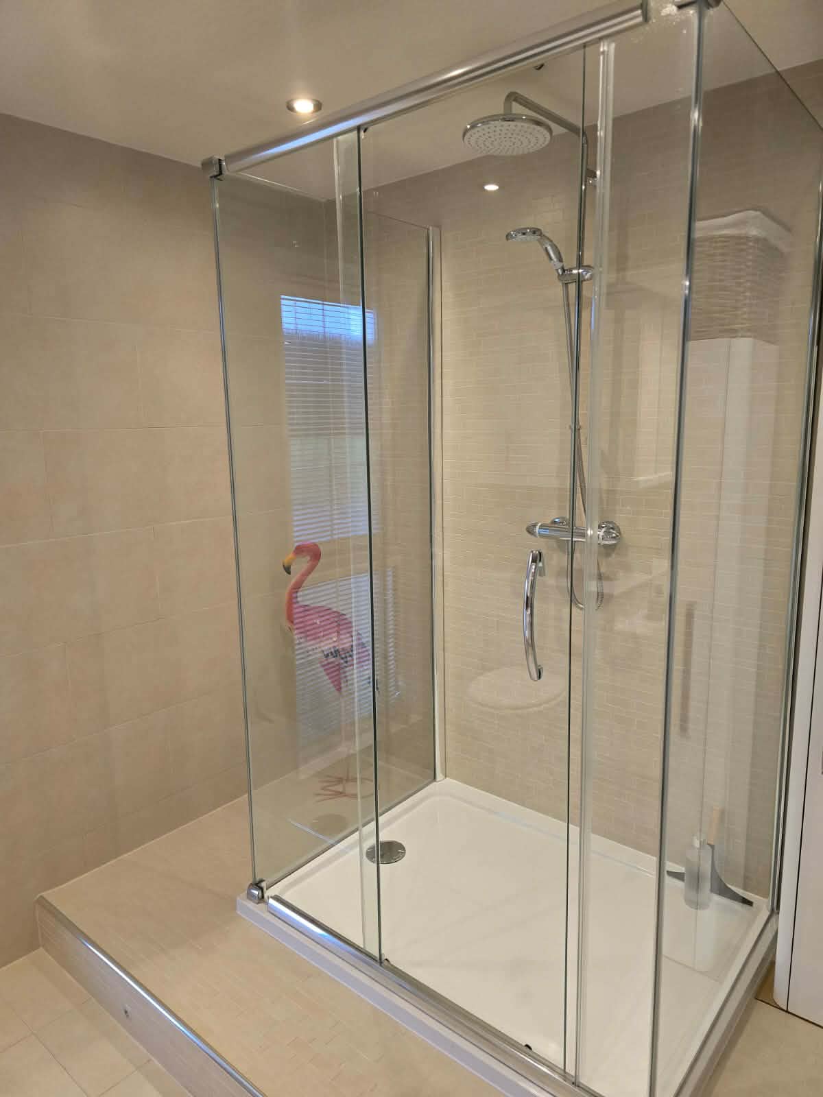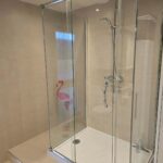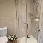 MAIN LUXURY BATH/SHOWER ROOM- superb double size shower cubicle with ‘rainforest’ shower fittings, low level WC, vanity hand basin, chrome ladder heated towel rail, recess lighting, tiled floors and walls, panelled radiator