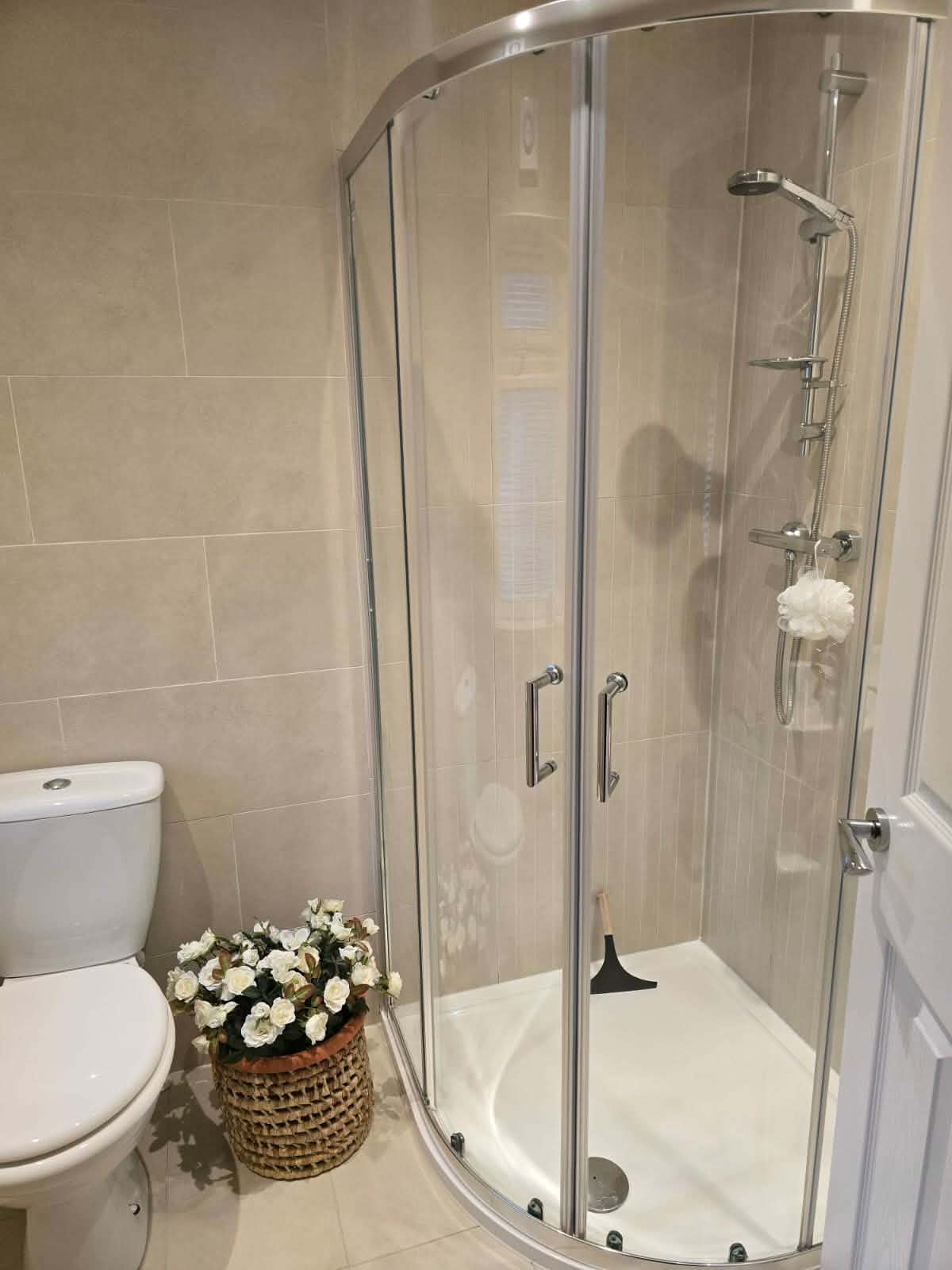EN-SUITE SHOWER ROOM- shower cubicle, hand basin, low level WC, part-tiled walls, double panelled radiator