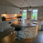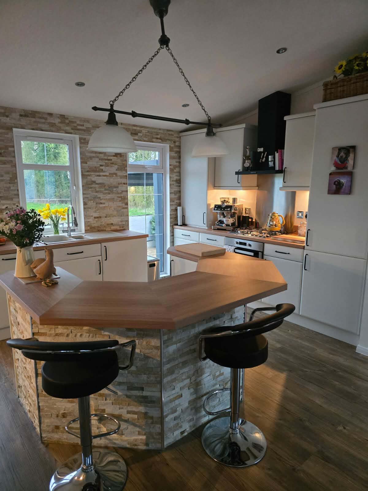 KITCHEN/DINER- 20’ x 15’3 overall max, superbly equipped kitchen area with 1 ½ bowl non-chip sink unit, cupboards under, extensive range of built in base and eye-level units, worktops etc, central island with storage under and breakfast bar, LPG gas hob with cookerhood over, electric oven, integrated fridge freezer, integrated Beko automatic washer/dryer and dishwasher, part tiled walls, double panelled radiator, ample power points, ‘engineering wood; flooring, feature central light, glazed Georgian style double doors to…