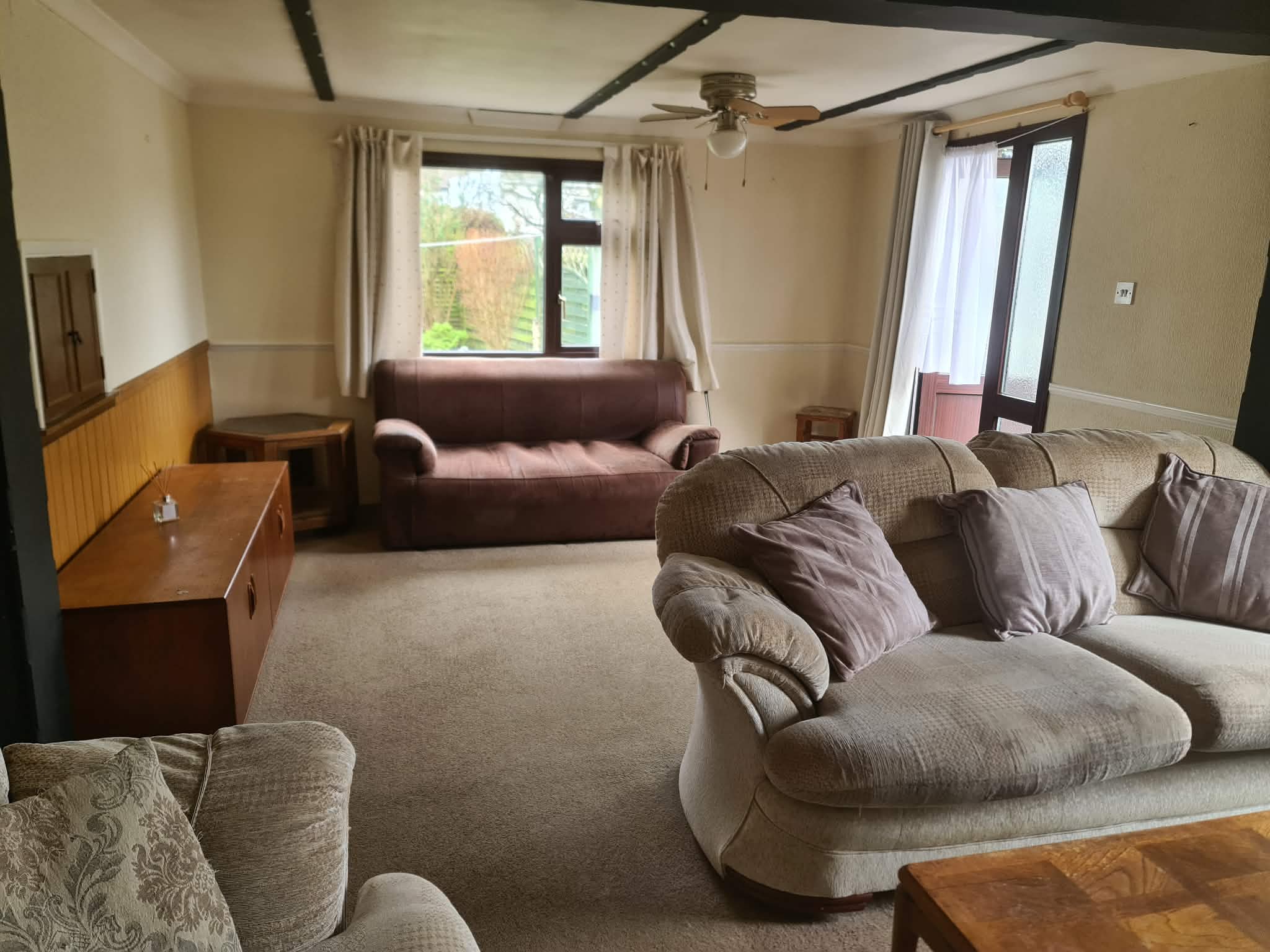 LOUNGE/DINER- 20’ x 13’3 narrowing to 11’9, 2 double panelled radiator, power point, mock beam ceiling, central light and fan, display unit, door to garden
