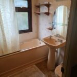 BATHROOM- bathroom suite comprising panelled bath with Triton continuous flow shower fitting, pedestal hand basin, low level WC, part-tiled walls, strip light and shaver point