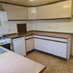 KITCHEN- 10’9 x 9’6, single drainer sink unit, cupboards under, range of built in base and eye level units, worktops etc, Flavel LPG gas cooker, plumbing for automatic washing machine, fluorescent light strip, power points, double panelled radiator