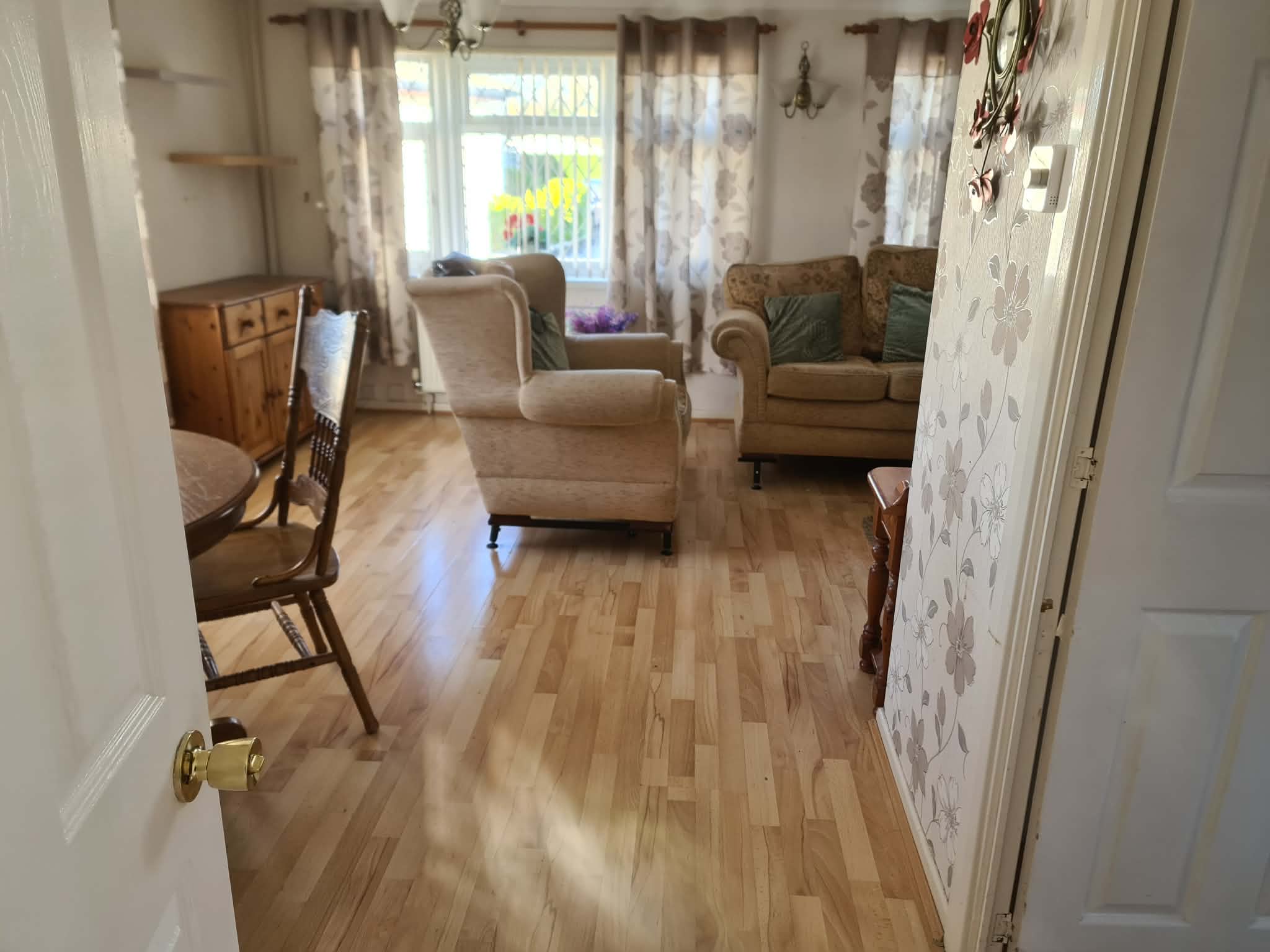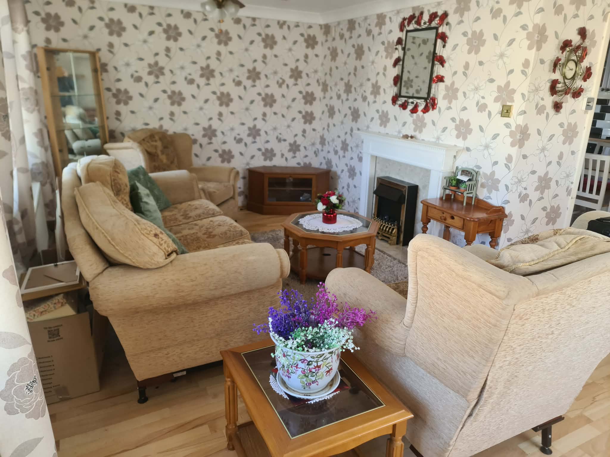 LOUNGE/DINER- 20’ x 16’6 max narrowing to 10’3, Adam style fire place with electric coal-effect fire, 3 double panelled radiators, power points, central fan