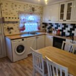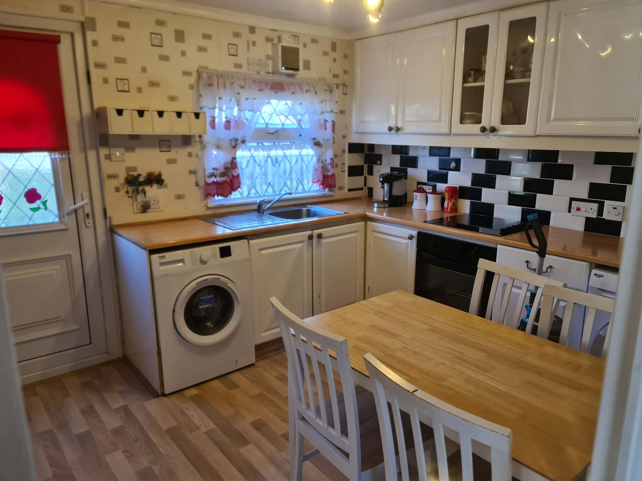 KITCHEN- 12’ x 9’9, single drainer sink unit with cupboards under, range of built in base and eye-level units, worktops etc, electric hob with electric oven under, plumbing for automatic washing machine, panelled radiator, ample power points, spotlights, extractor fan, part-tiled walls, cupboard enclosing Worcester LPG gas combi boiler for central heating and domestic hot water