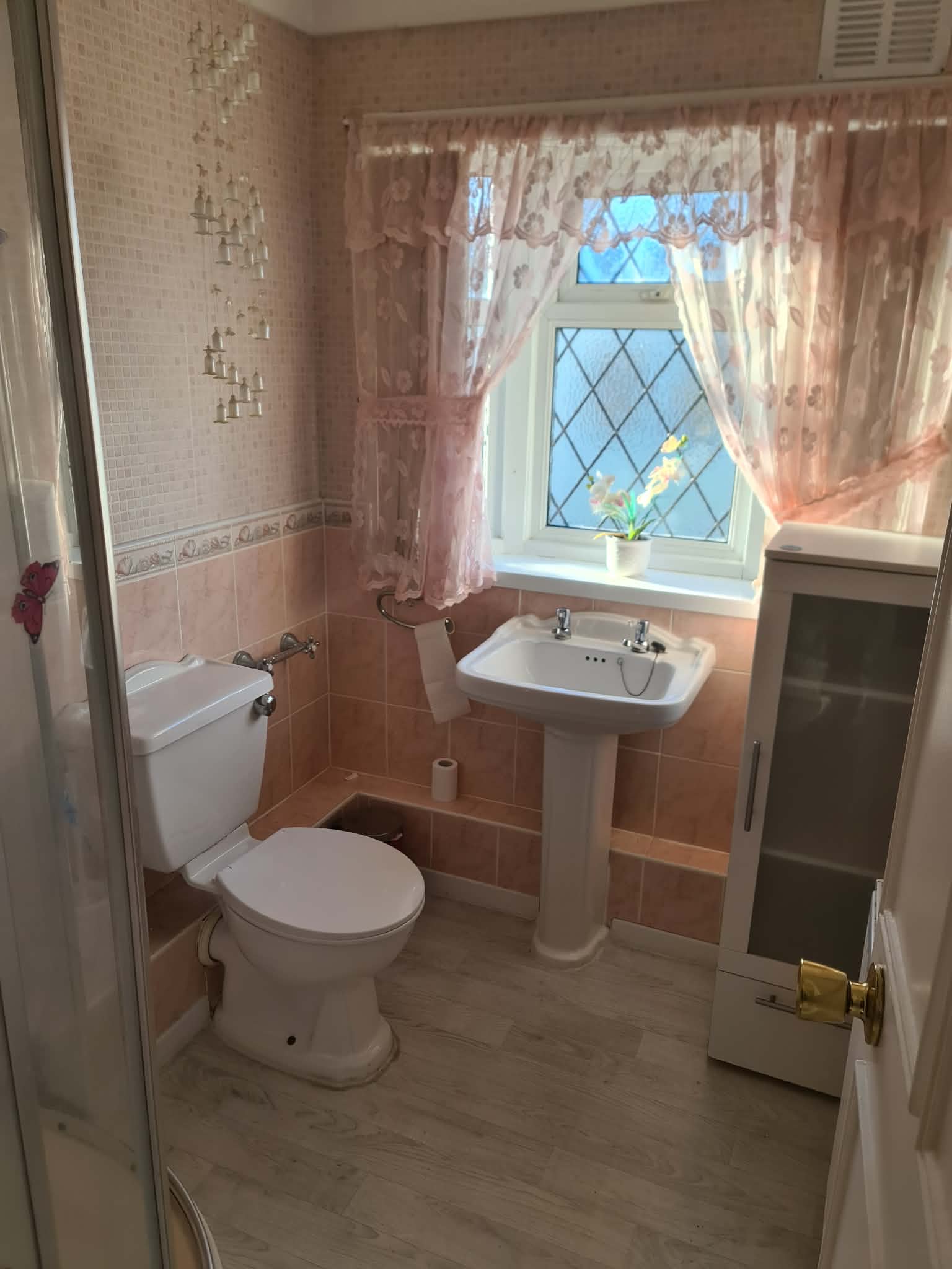 SHOWER ROOM- corner shower cubicle, low level WC, pedestal hand basin, double panelled radiator, part-tiled walls