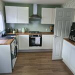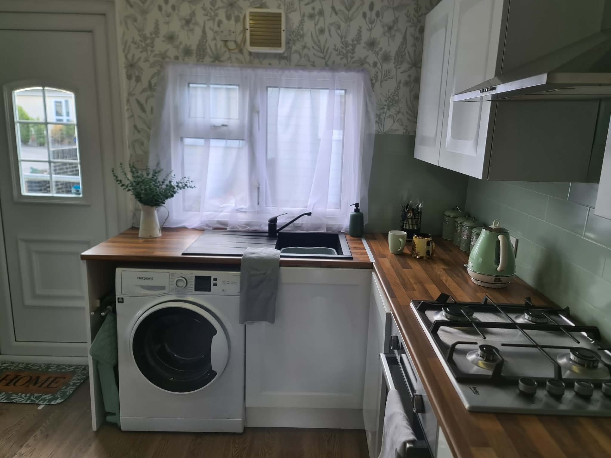 FITTED KITCHEN- 11’9 x 9’9, black non-chip sink unit, cupboards under, range of built in base and eye-level units, worktops etc, LPG gas hob with cooker-hood over and electric oven under, extractor fan, plumbing for automatic washing machine, part-tiled walls, power points, cupboard enclosing Vaillant LPG gas combi boiler for central heating and domestic hot water, door to garden