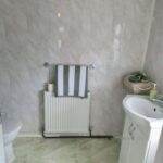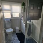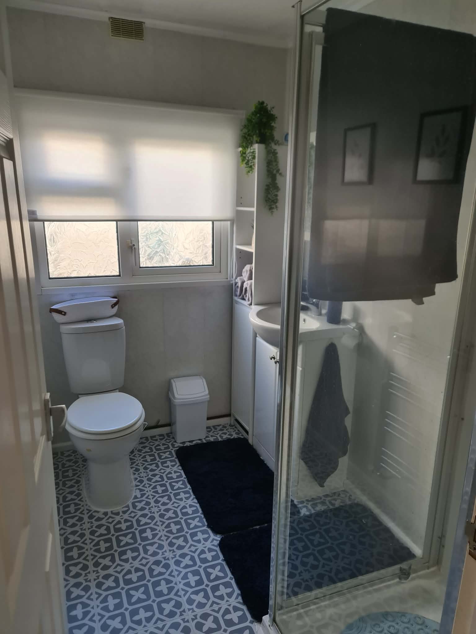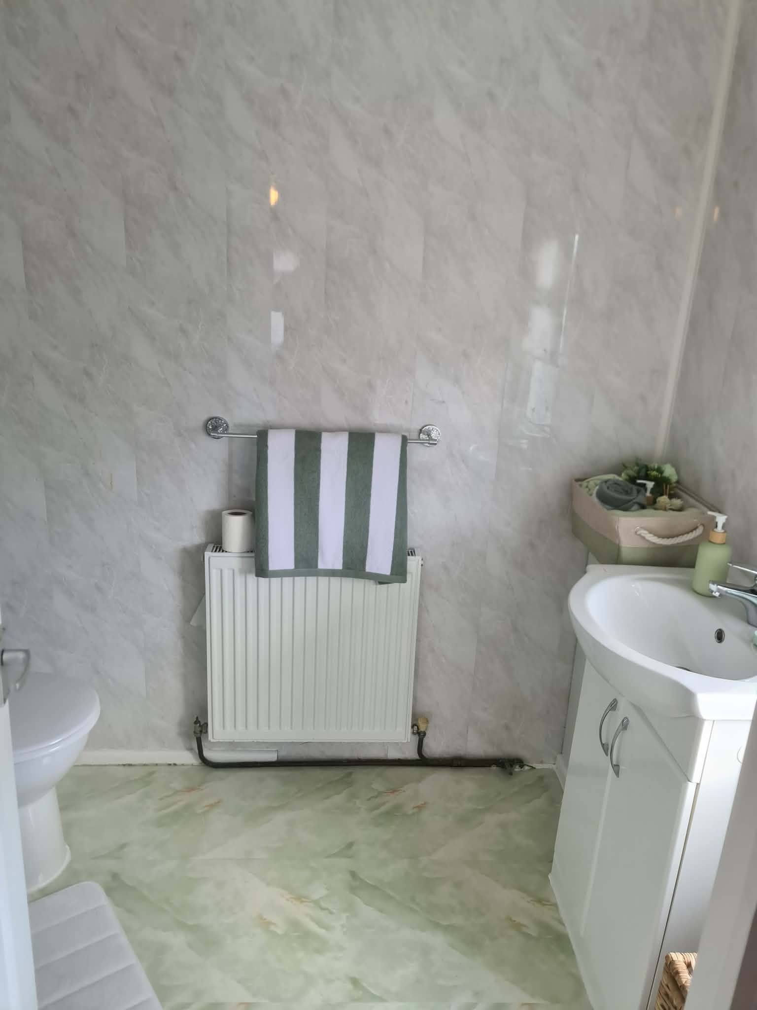 SHOWER ROOM- shower cubicle, vanity hand basin, low level WC, waterproof walling, chrome effect heated towel rail