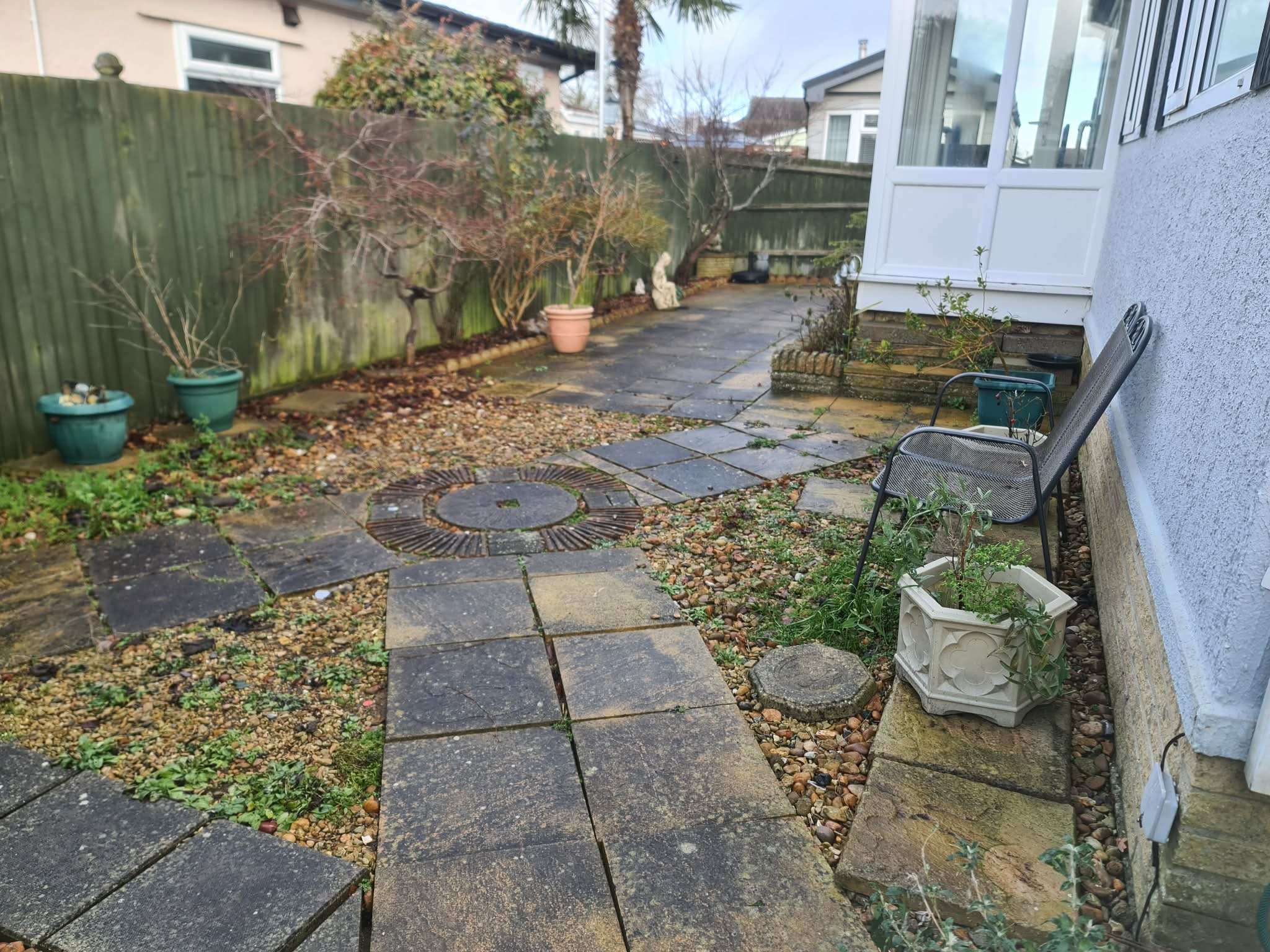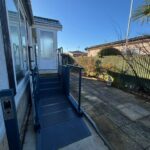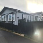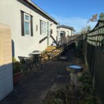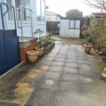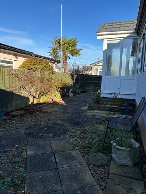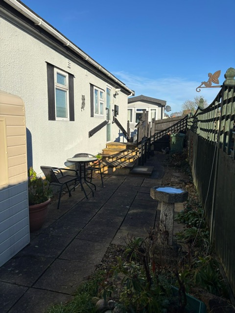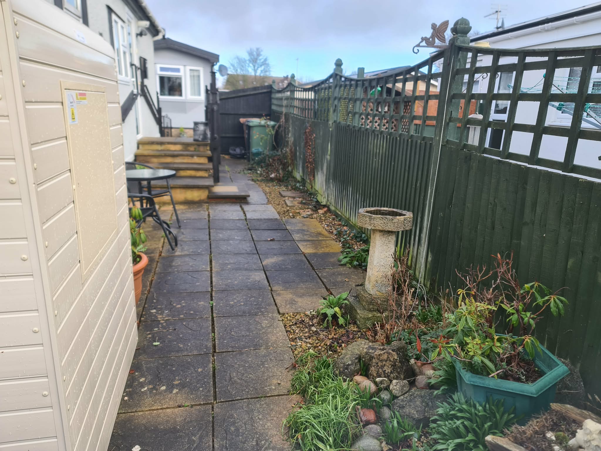 GARDENS approximately 50’ x 50’ overall, extensive paving for low maintenance, scope to form on site car parking if required, block store, metal shed, housing for solar panel equipment, under chassis insulation, textured walls, brick built skirt, Decra style roof with solar panels