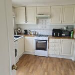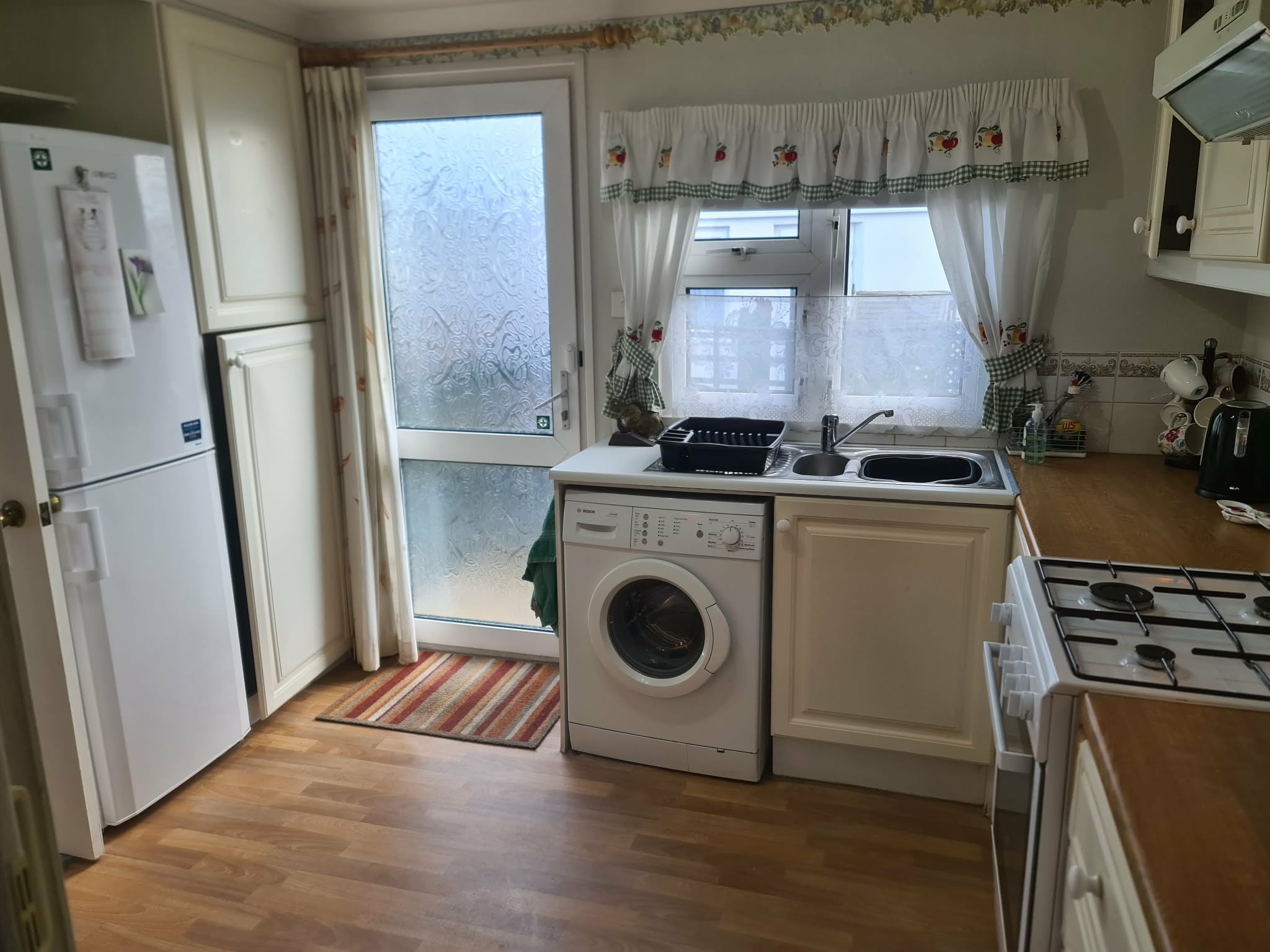 KITCHEN- 11’6 x 9’3 maximum, single drainer stainless steel sink unit, cupboards under, range of built in base and eye-level units, worktops etc, part-tiled walls, plumbing for automatic washing machine, power points, cupboard enclosing Vaillant mains gas combi boiler for central heating and domestic hot water, door to garden