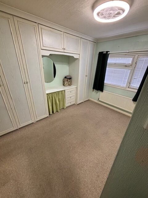 BEDROOM 2- 9’6 x 8’ excluding wardrobe area, 2 double wardrobes, dresser unit with cupboards over, wall light point, panelled radiator, power points