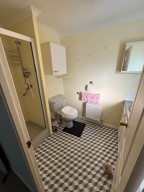 WET ROOM- shower fitting with low level shower doors, part-tiled walls, pedestal hand basin, low level WC, double panelled radiator, extractor fan