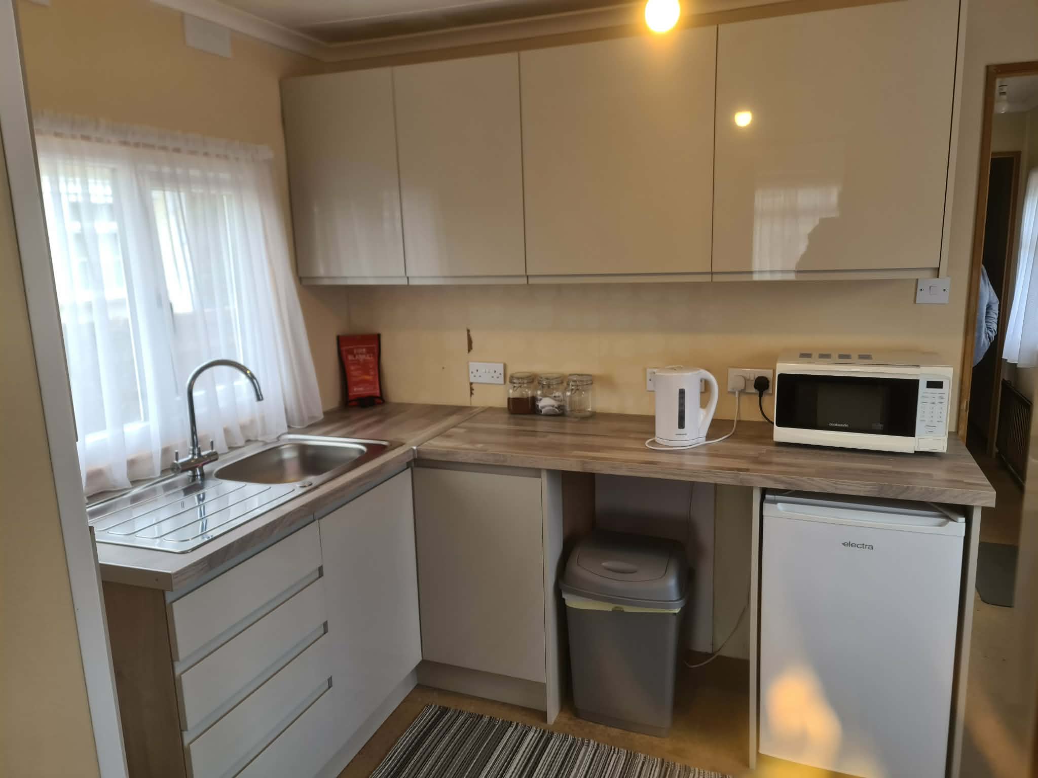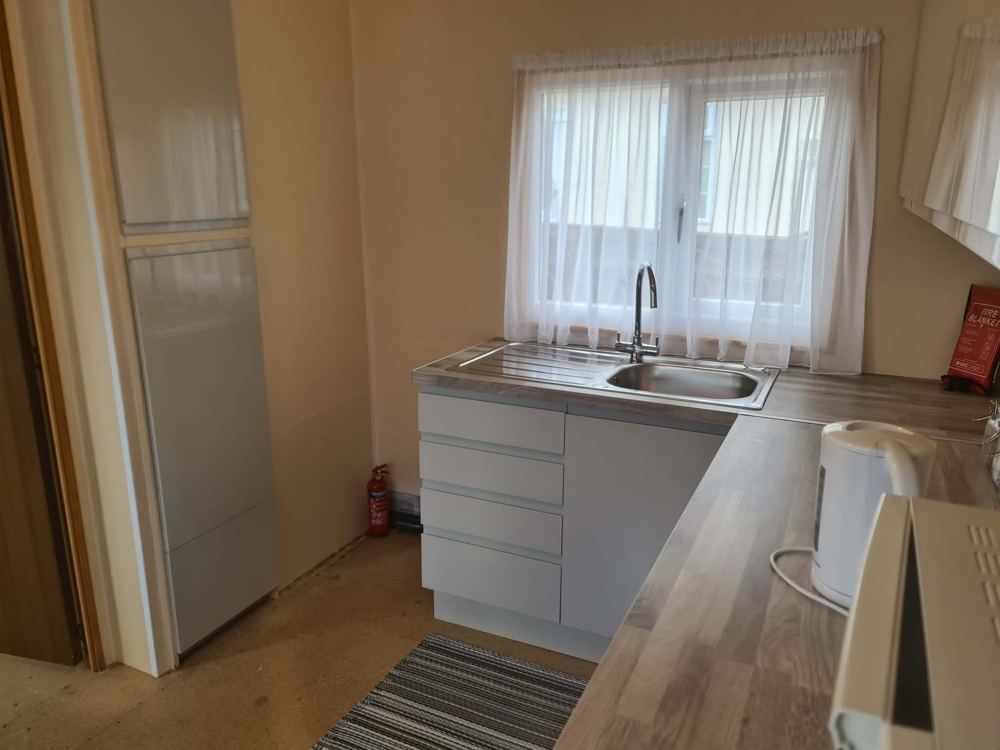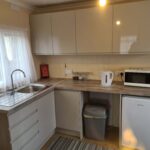 KITCHEN- 10’ x 7’, single drainer stainless steel sink, drawers and cupboards under, base and eye-level units, worktops etc, cupboard enclosing Vaillant mains gas combi boiler for central heating and domestic hot water, panelled radiator, power points